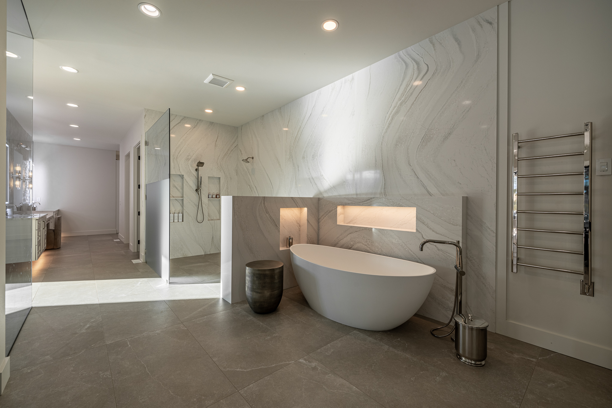 Formed when limestone undergoes heat and pressure, marble’s smooth texture and distinctive veining create timeless elegance. It’s available in shades of white, gray, brown, and black. While softer and more porous than other stones, marble’s beauty makes it ideal for bathrooms, accent walls, and statement features. It’s less suited to high-use kitchens, as it can stain or etch from regular exposure to acids and spills.